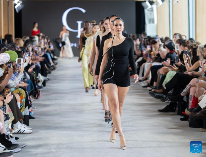 A model presents a creation at the 2025 Fashion Art Toronto’s Fashion Week Spring/Summer in Toronto, Canada, on May 29, 2025. Featuring collections from over 40 Canadian designers, the annual fashion show kicked off here on Thursday. (Photo by Zou Zheng/Xinhua)