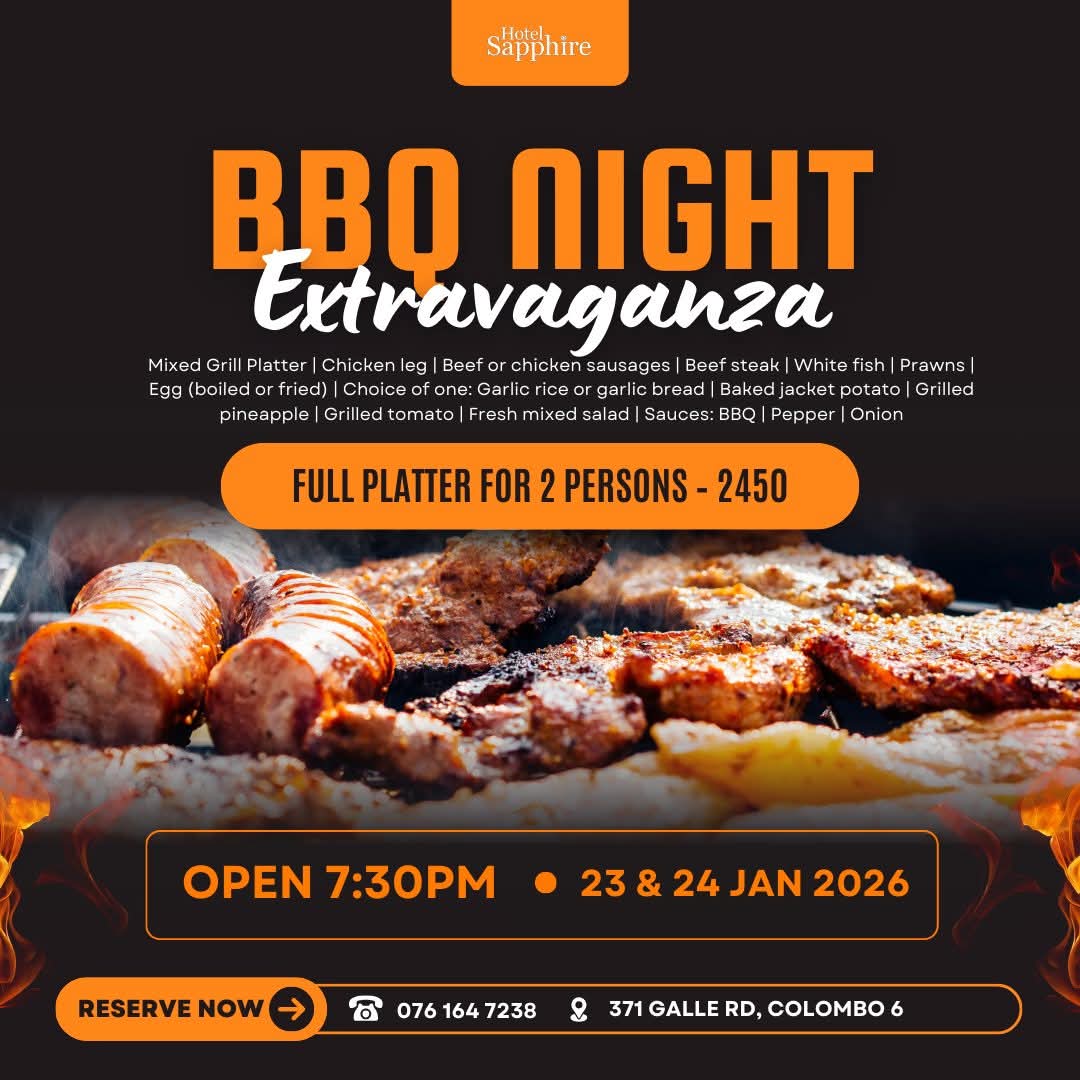 Food lovers are invited to enjoy an evening of expertly grilled delights at Hotel Sapphire, located along Galle Road, Colombo 06. The event offers a wide selection of BBQ platters, carefully curated to suit different tastes and preferences.