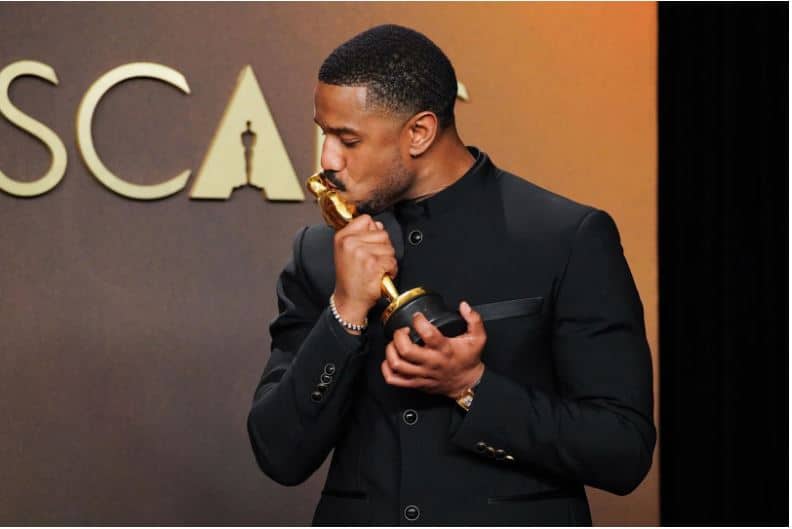 First-time Oscar nominee Michael B. Jordan won the Best Actor award on Sunday for his dual portrayal of twin brothers in the genre-blending vampire drama “Sinners.”