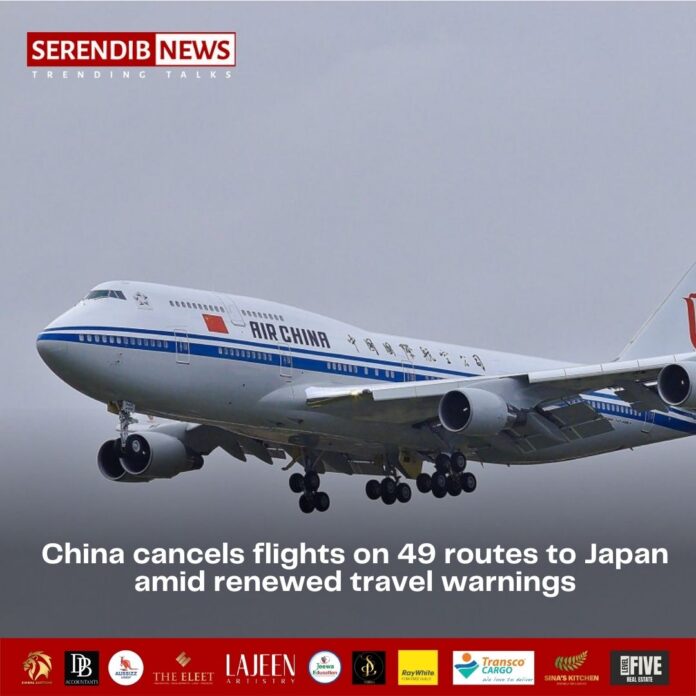 China has cancelled all scheduled flights on 49 air routes with Japan as the Chinese foreign ministry reiterated travel warnings, urging citizens to avoid visiting Japan, especially during the upcoming Chinese New Year holiday.