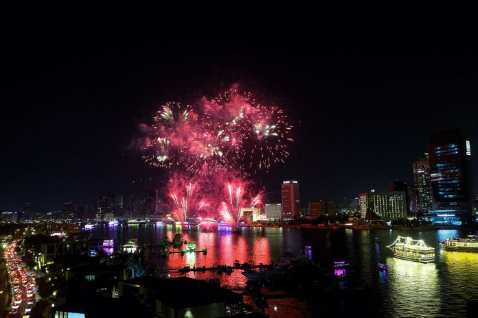 Hundreds of spectators were treated to a three-minute fireworks display over the Creek, set against the charming heritage backdrop of Al Seef’s dhows and old-world architecture, blending tradition with modern festivity.