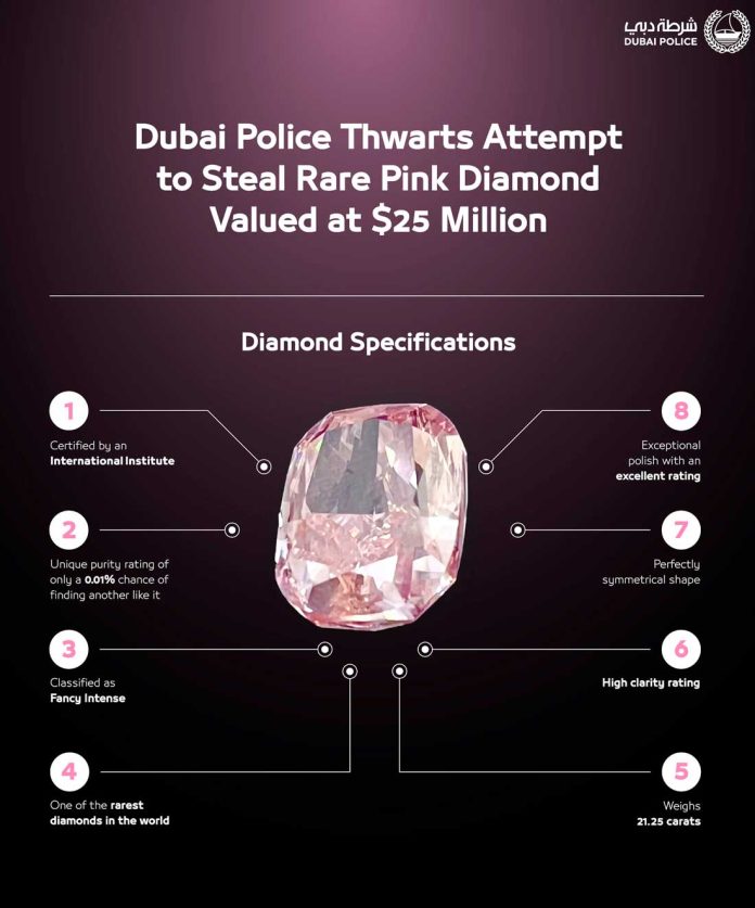 Dubai police have successfully foiled an elaborate attempt to steal and smuggle a rare pink diamond valued at $25 million, authorities announced on August 18.