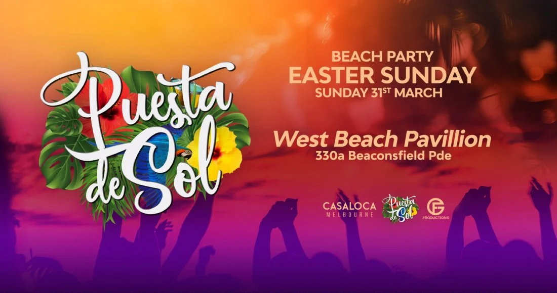 Get ready for an unforgettable journey at the highly-anticipated Puesta De Sol Beach Party – Easter Edition, happening on Sunday, March 31st, 2024, from 5:00 PM to 11:30 PM at the stunning West Beach Pavilion in Saint Kilda West, Melbourne, Australia. This landmark event marks the debut of Puesta De Sol on Easter Day, promising an unmatched celebration.