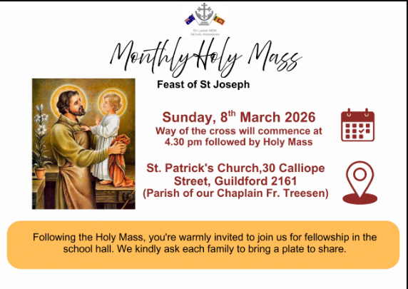 The Feast of St Joseph will be celebrated with the Monthly Holy Mass on Sunday, 8 March 2026, at , located at 30 Calliope Street, Guildford 2161, Australia.