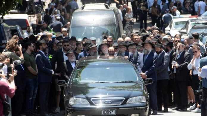 Mourners gathered to pay their final respects to British-born Rabbi Eli Schlanger, one of those killed in the attack. Emotional scenes unfolded as grieving family members and community members sobbed outside the funeral venue while the coffin was carried inside. Police officers stood in salute as the procession passed.