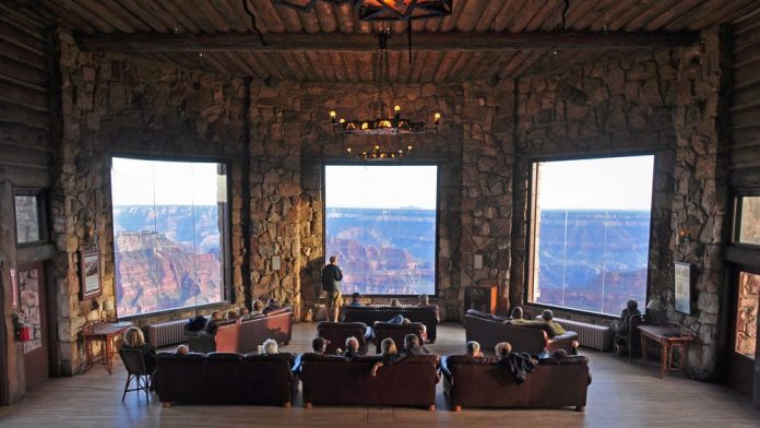 The National Park Service praised architect Gilbert Stanley Underwood for designing the building to harmonize with the canyon’s natural environment. It included a saloon, coffee shop, gift shop, deli, visitor center, and over 110 cabins.