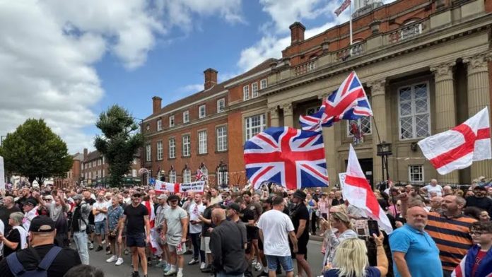 Nuneaton, England – Hundreds gathered outside Nuneaton Town Hall on Saturday to join an anti-immigration protest. The demonstration featured a march through the town centre, with participants waving England and Union Jack flags and chanting anti-government slogans.