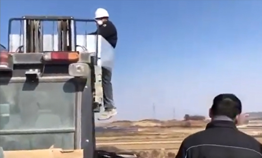 The incident occurred around noon on Feb. 26, when the worker was hoisted into the air by a forklift while tied with white plastic sheeting.