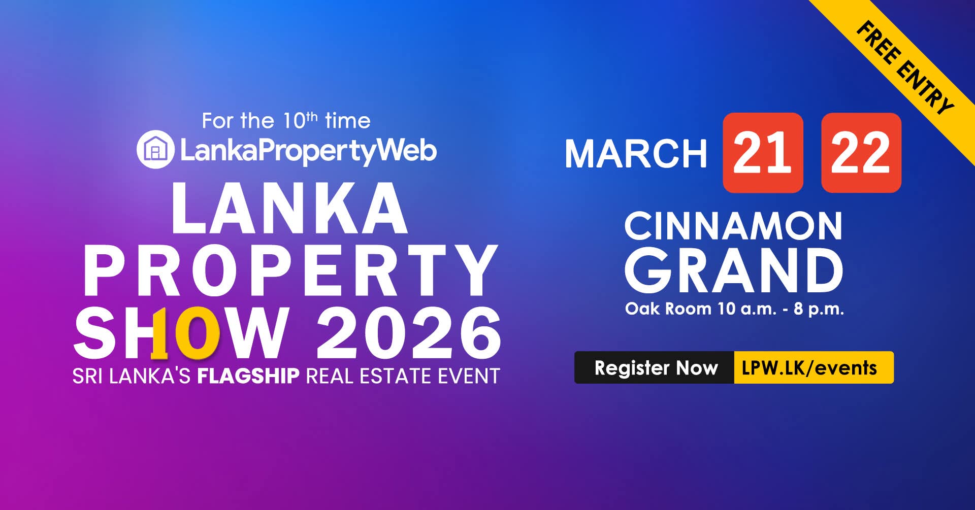 LankaPropertyWeb, Sri Lanka’s leading online real estate marketplace, will host the Lanka Property Show 2026 on March 21 and 22 at the Cinnamon Grand Oak Room in Colombo. The event marks the 10th edition of Sri Lanka’s flagship real estate exhibition and is expected to attract industry professionals, investors, buyers, and property enthusiasts from across the country.