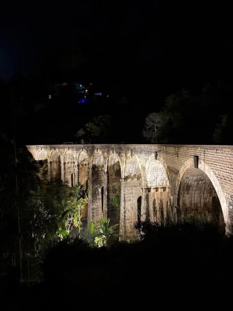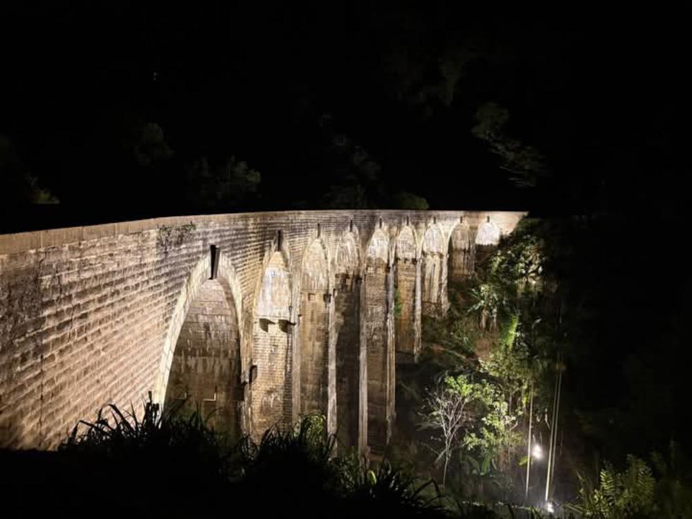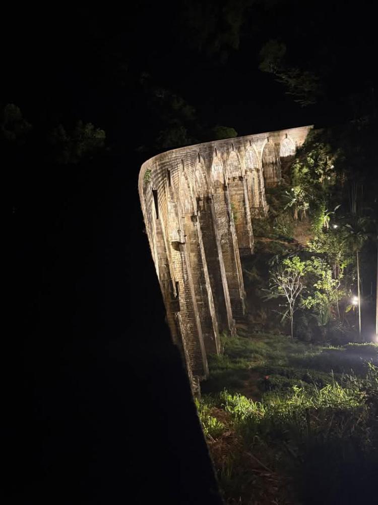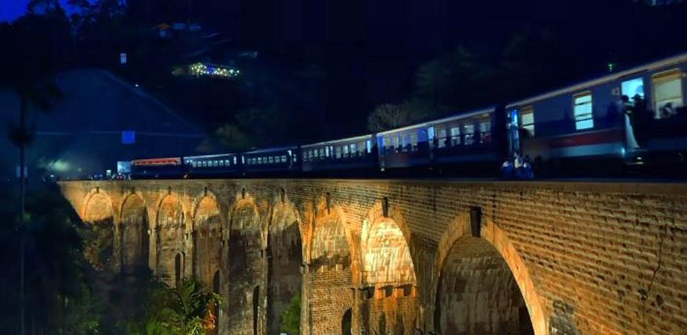 The iconic Nine Arch Bridge in Ella-one of Sri Lanka’s most celebrated tourist landmarks—has been illuminated under a heritage monument lighting project jointly executed by the Department of Railways and the Central Cultural Fund.