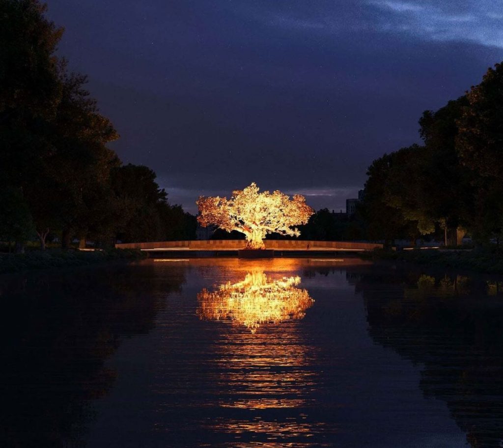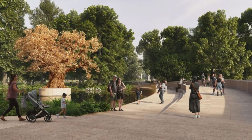 Tom Stuart-Smith: A life-sized bronze oak tree on a plinth in the lake and a path of stones from across the UK, symbolizing the Queen’s legacy and national unity.