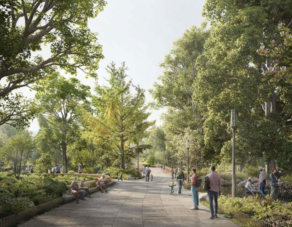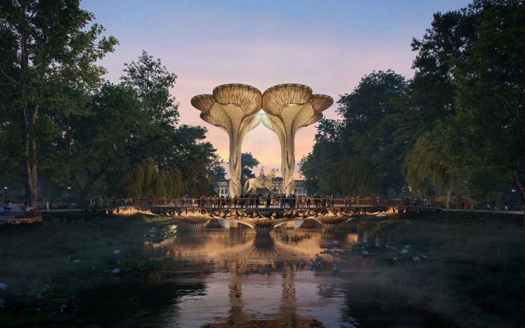 Foster + Partners: An elegant equestrian statue along a tree-lined avenue, with gardens and a “Unity Bridge” reflecting her unifying presence.