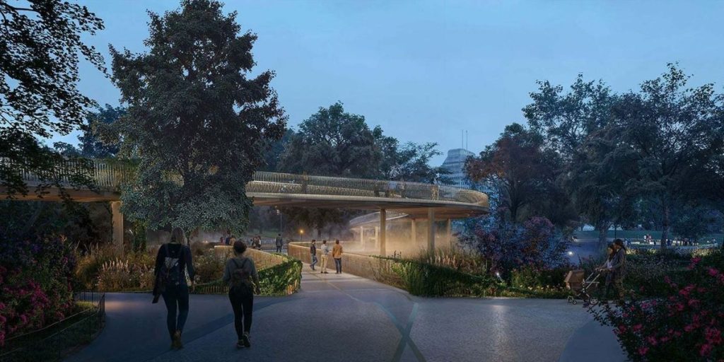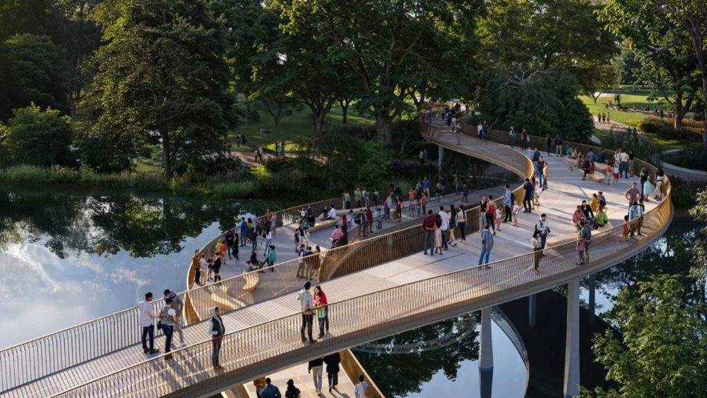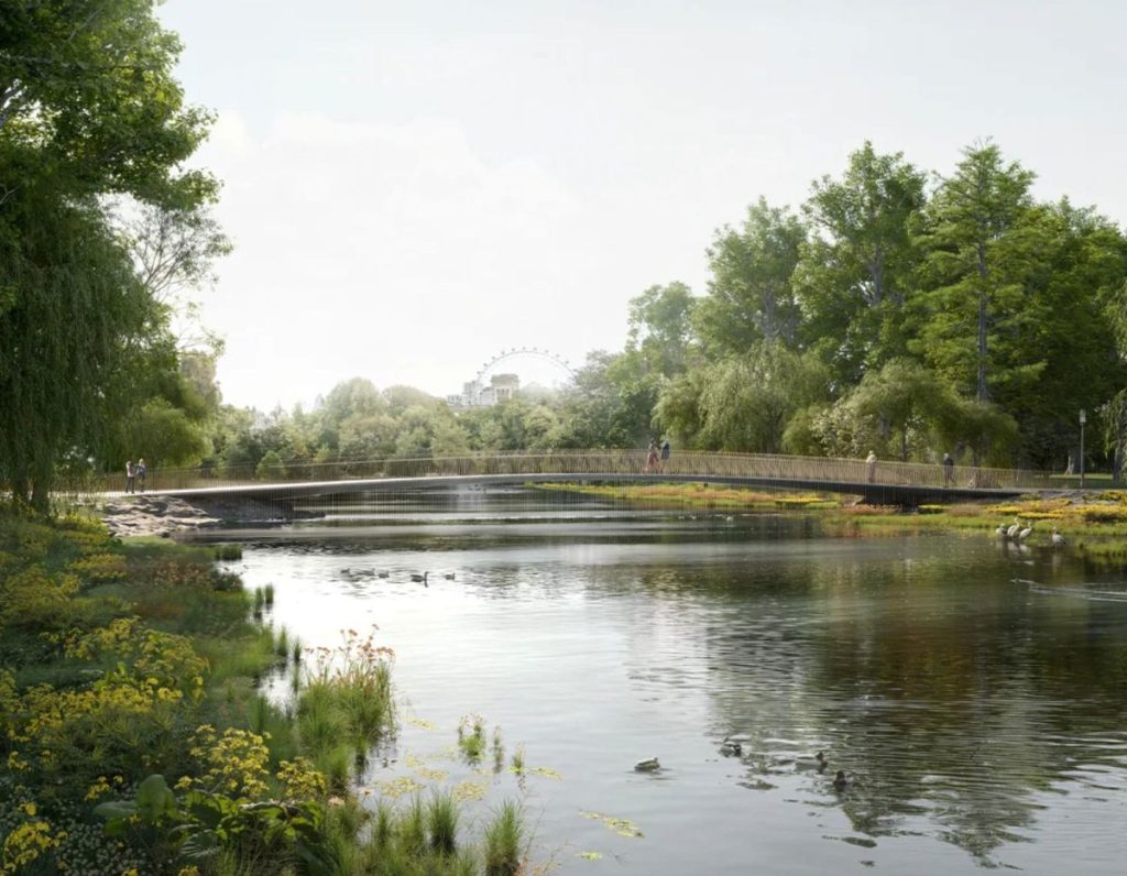 Wilkinson Eyre: Dual-level bridges over St James’s Park Lake offering panoramic views of royal landmarks and the London skyline.