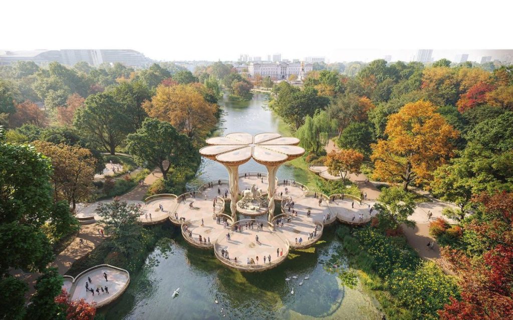 Heatherwick Studio: A striking canopy of giant limestone lily pads symbolizing the Queen’s 70-year reign, rising above a statue of the monarch.