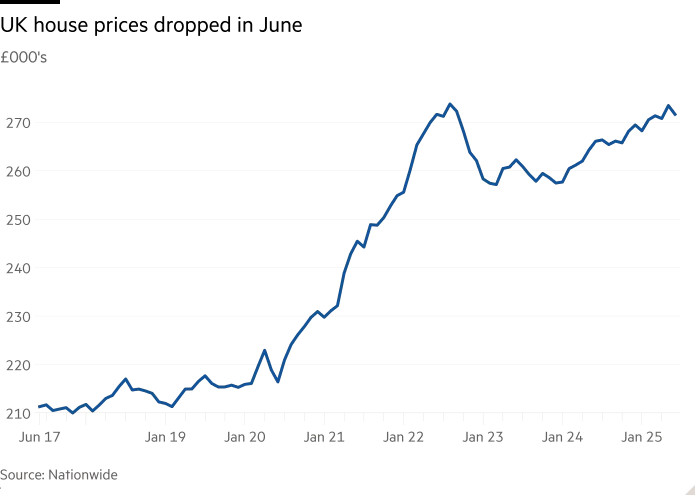 UK house prices fell unexpectedly in June, according to Nationwide, undershooting forecasts and recording their largest monthly fall since January 2023.