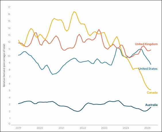 Australia’s market share of global student interest is 8% higher since January, potentially influenced by the drops in student interest for competitors.