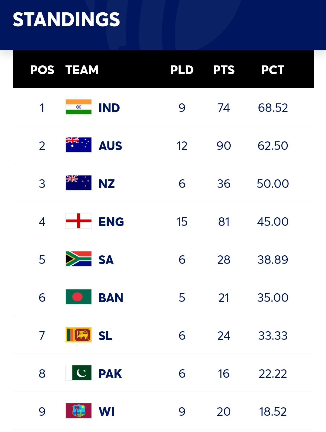 England’s point percentage in the ICC World Test Championship 2023-25 improved to 45 courtesy of their 190-run win at Lord’s.